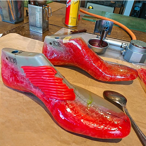 採寸→木型→型紙ときたら、フィッティング用の革で一足作ります。その靴で本番の靴の制作の前に、木型が合っているのかのチェックを行い、靴のカラーや細かいデザインなどを打ち合わせていきます。